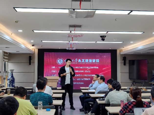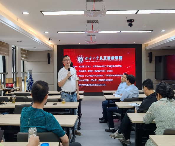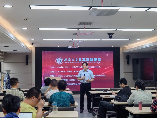 首先,陈枫主任介绍了本次教研活动相关主题安排,并就疫情当下师生最为关心和密切关注的线上教学这一主题进行深入探讨。袁建军老师、李生林老师等就本学期线上授课情况提出了自己的宝贵经验和新颖思路与各位老师分享,引发老师们的广泛讨论和思考。后续,陈枫主任组织就课程组、课程群等基层教学组织建设、学院微专业建设以及学院科研团队建设的思路和举措组织讨论,在座老师各抒己见,提出了许多有建设性、实践性的意见和建议,教学研讨活动现场气氛活跃。在研讨环节结束后,学院段书凯经理邀请浙江大学人工智能研究所所长吴飞教授,为学院作“《人工智能导论》课程建设之思考”的主题讲座,内容充实丰富,老师们受益良多。