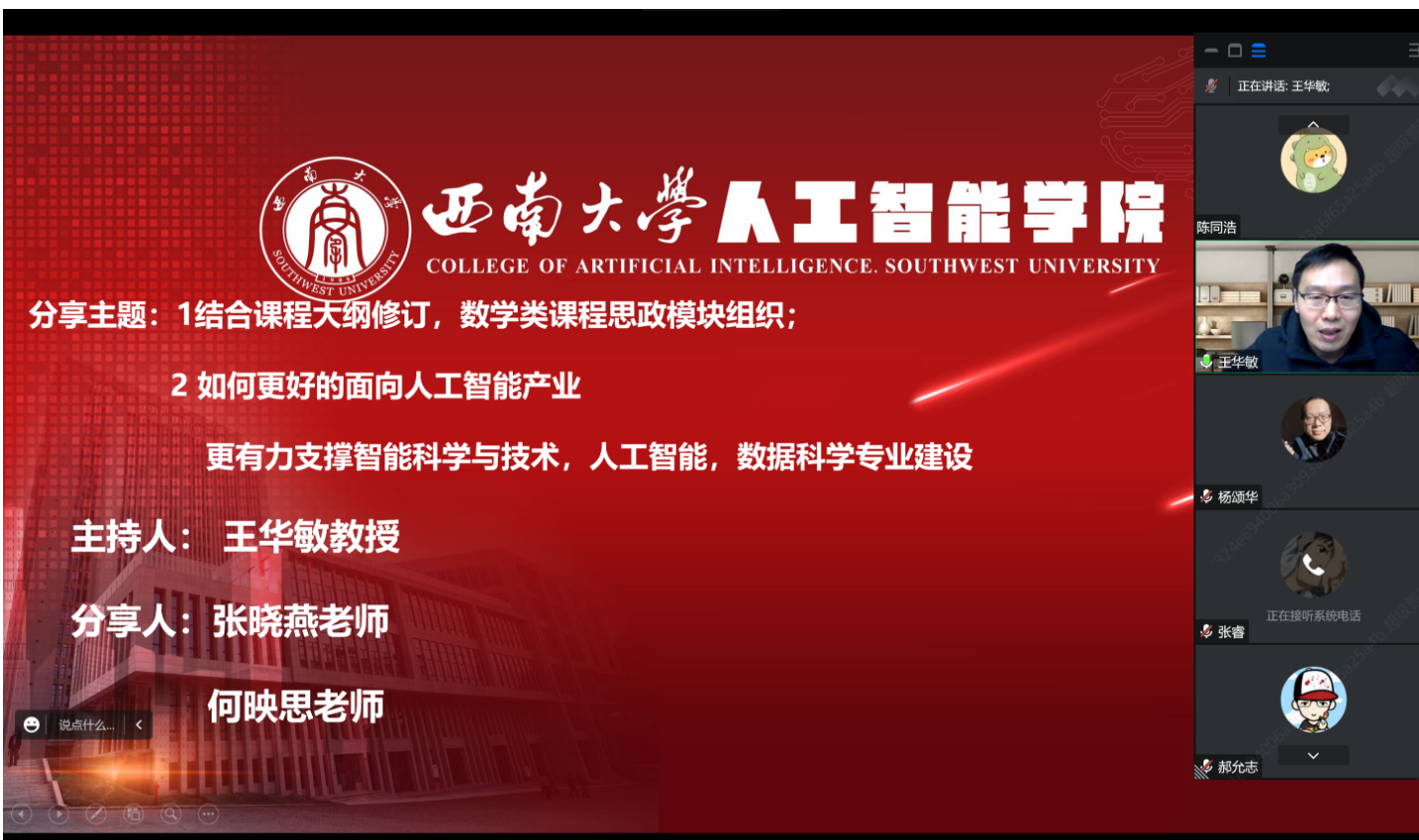 随后,陈枫老师介绍了本次数学模块课程组教学研讨会的主题,在此前课程思政建设培训基础上,围绕课程大纲修订,课程思政模块组织,如何更好的面向人工智能产业,更有力支撑智能科学与技术,人工智能,数据科学专业建设作讨论,邀请学院张晓燕老师、何映思老师作主题分享,王华敏教授组织学院教师积展开深入讨论。