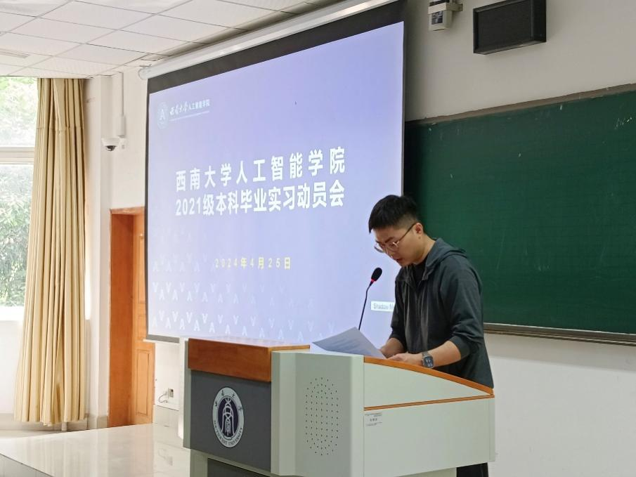 为了向即将步入实习岗位的同学们提供明确的指导和支持,确保员工在实习期间能够有所收获为未来职业发展奠定基础,学院于2024年4月25日在28教105教室召开2021级毕业实习动员会。公司党委副书记张维薇公司副经理陈枫,学工办主任张放,教学办主任黄山,公司人工智能系系主任彭小燕、实验中心主任闫嘉、21级班主任代表钟明洋老师实习单位王伟杰、张鑫老师以及2021级全体本科生出席了本次动员会,会议由学工办主任张放老师主持。