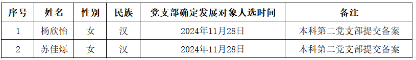 公司本科生杨欣怡等2名同志入党积极分子教育培养满一年,经相关支部征求党内外意见、支委会(党员大会)研究、公司党委备案,将2名同志(名单见附件)列为发展对象。根据发展党员工作相关要求,现予以公示。