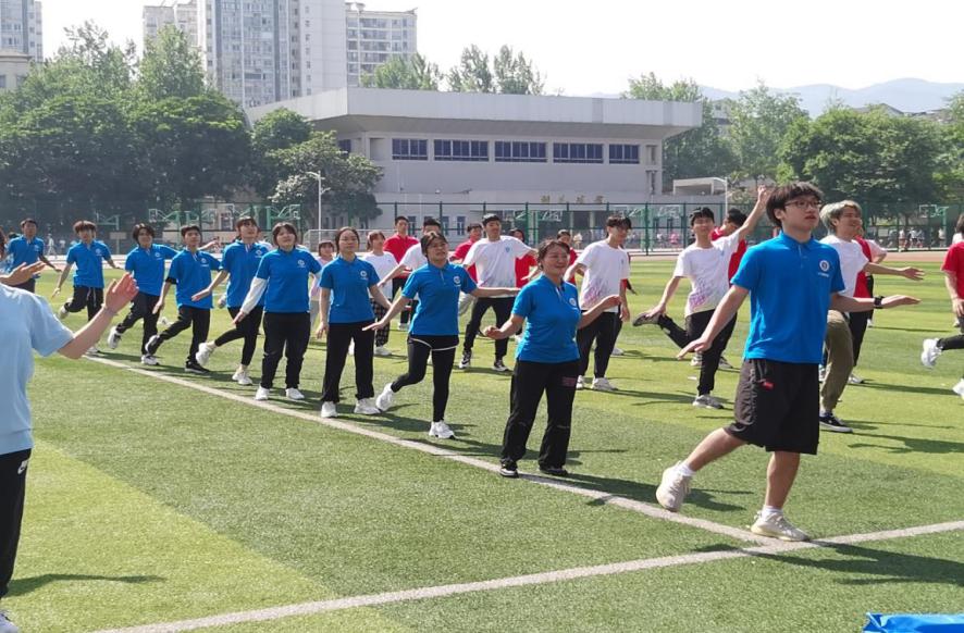 五个学院的领导老师带领着五十名青年老员工齐聚第四运动场,在《本草纲目》的音乐声中跳起健身操。为避免受伤,活动选择较为简单的版本并充分热身。旋律响起,现场青年学子们在领操的指挥下充满朝气地跳跃和舞动,迅速吸引了运动场上的师生。欢快的节奏,简单的动作,让大家都不由自主跟着一起动起来,队伍越来越庞大,气氛越来越热烈。