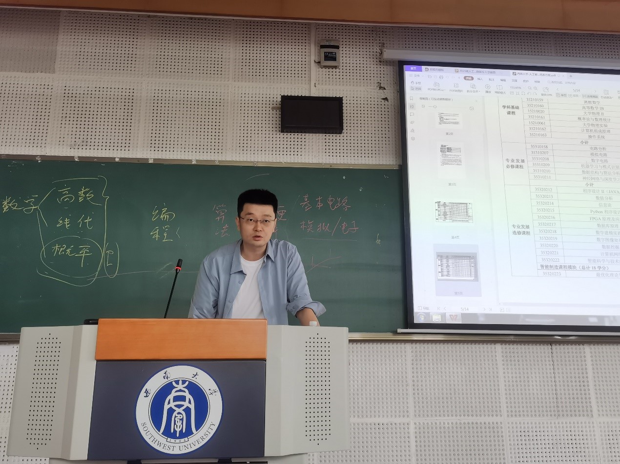 黄山老师为新生同学讲述本科教学相关内容,黄老师从培养方案出发,为同学们分析课程结构,选课方案,考试内容等,让同学们了解人工智能和智能科学与技术两大专业,希望新生可以培养学习意识,认清学习目标,完成学习任务。随后,学院智能科学系系主任陈枫教授从人工智能和智能科学与技术两大学科学习纲领出发,为同学们深入解读学科知识,陈枫教授建议新生们提前做好学业生涯规划,在学习实践中培养扎实的专业能力,提升自身专业素养。
