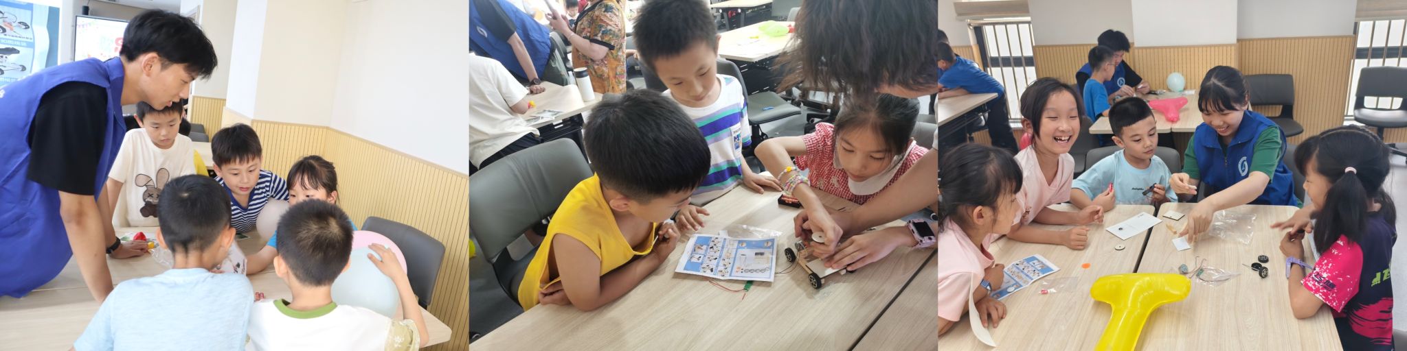 (志愿者协助小朋友制作声控小车)