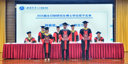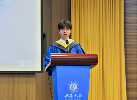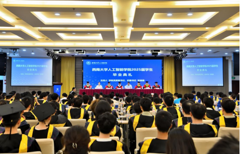 在毕业典礼上,学院教师代表、毕业年级班主任钟明洋老师向同学们送上热烈祝贺,希望大家坚守初心、勇于担当,保持终身学习,感恩他人,豁达面对起伏;母校永远是坚实后盾,愿同学们以“不惧挑战,主宰战场”的勇气,书写辉煌人生,前程似锦。数据科学与大数据技术专业本科毕业生陈俊霖、计算机科学与技术专业硕士毕业生张世超作为毕业生代表发言。陈俊霖在致谢母校、师长与同窗的同时,回顾四年与学院共成长的求学点滴,感悟技术需融入人文关怀与社会责任感的真谛,愿毕业生们携 “天生路 2 号” 的烙印奔赴未来,以智能之力服务大众、不负时代。张世超以感恩之心回顾三年求学中学习科研、竞赛实践与校园生活的成长点滴,呼吁在 AI 时代永葆终身学习热忱,愿毕业生们前程似锦、为社会发展贡献力量。