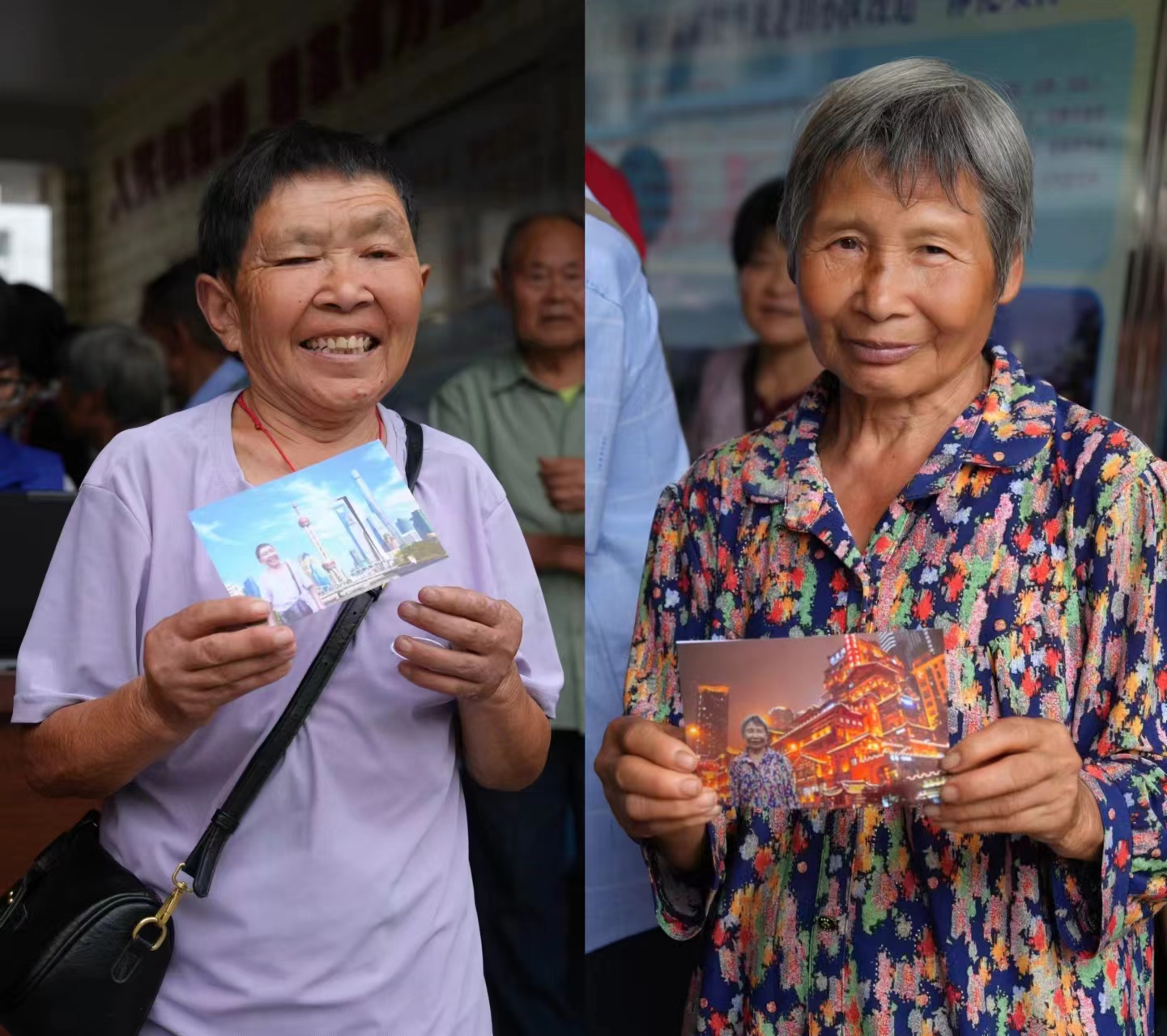 “这里的很多老人,他们一辈子都没离开过这个小镇,他们也想去见见外面的世界,留下旅行的足迹……”为满足镇上老人们的需求,AI照相馆的成员们于7月3日至4日间,利用自主改进的AI技术将照片背景替换成各种风景名胜,真正实现了AI云旅游,让村民们足不出户就能与全国风景名胜合影留念,同时也利用AI技术软件对老照片进行翻新和修复,让村民们的美好记忆继续延续。
