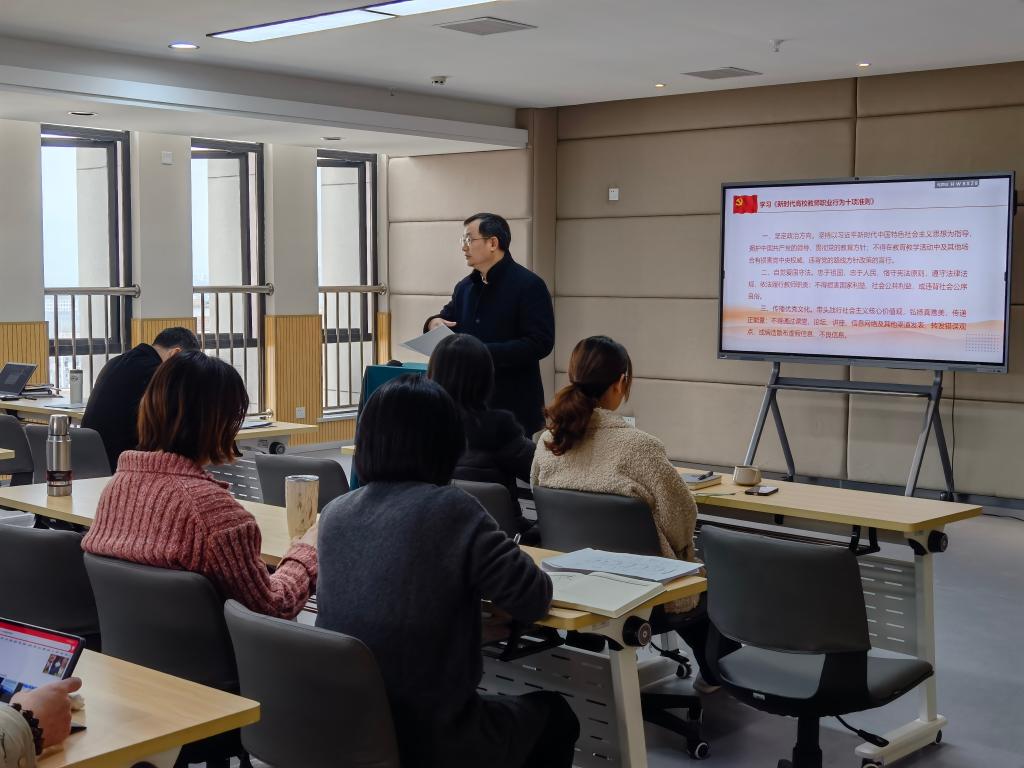 会议首先进行政治理论集中学习。夏俊带领大家以视频学习、分享学习心得相结合的方式,学习了习近平总书记在省部级主要领导干部学习贯彻党的十九届六中全会精神专题研讨班开班式、十九届中央纪委六次全会、中央全面深化改革委员会第二十四次会议上的重要讲话精神。学院经理、党总支副书记段书凯带领大家逐条学习了《新时代高校教师职业行为十项准则》,结合工作实际进行了详细解读,强调全体教职工要规范职业行为,严守师德底线,做好教书育人的表率。夏俊就相关具体要求作了补充强调。