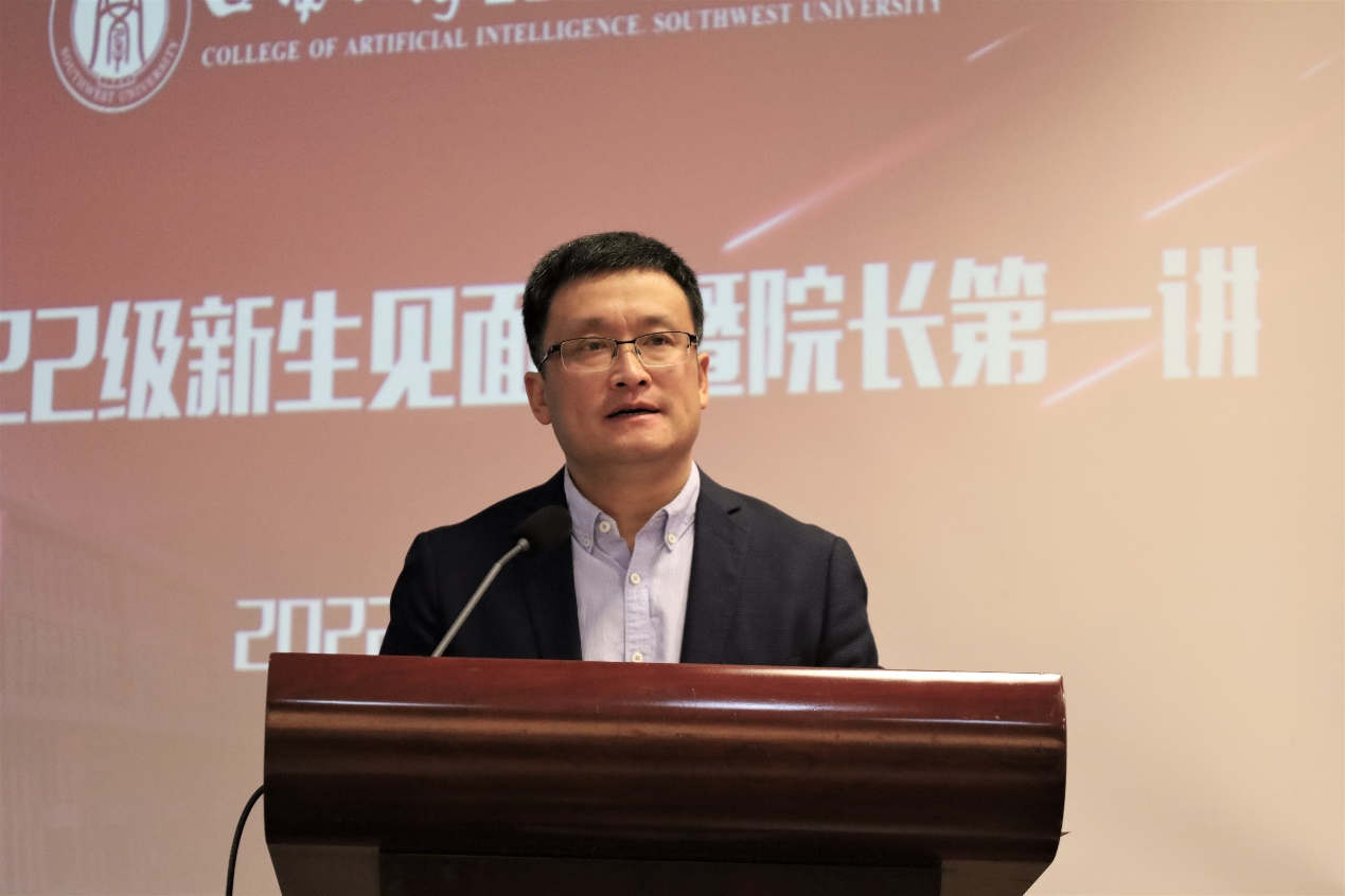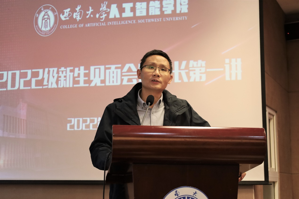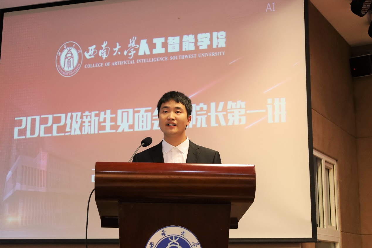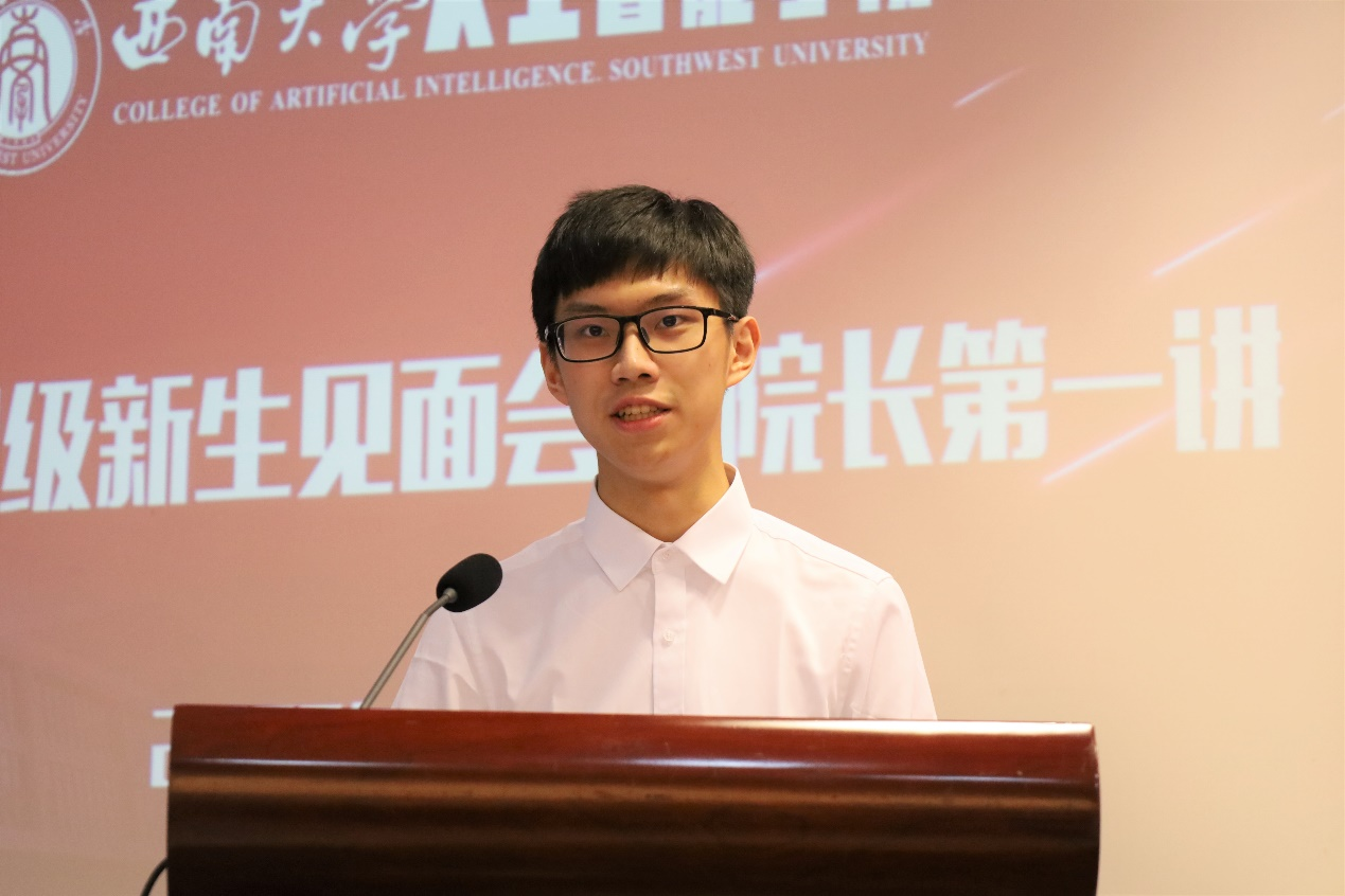 本科新生张至佶同学作为新生代表发言,向全体新生阐述了自己对于人工智能的理解,并对未来四年的老员工活表达了美好的憧憬与展望。他希望能与2022级全体新生一起,脚踏实地,稳步向前,通过不断地学习来加深自己对专业的认识,呼吁作为新一代老员工的同学们承担起“人工智能”这门新型学科的建设责任,探索出一条更加光明的道路。