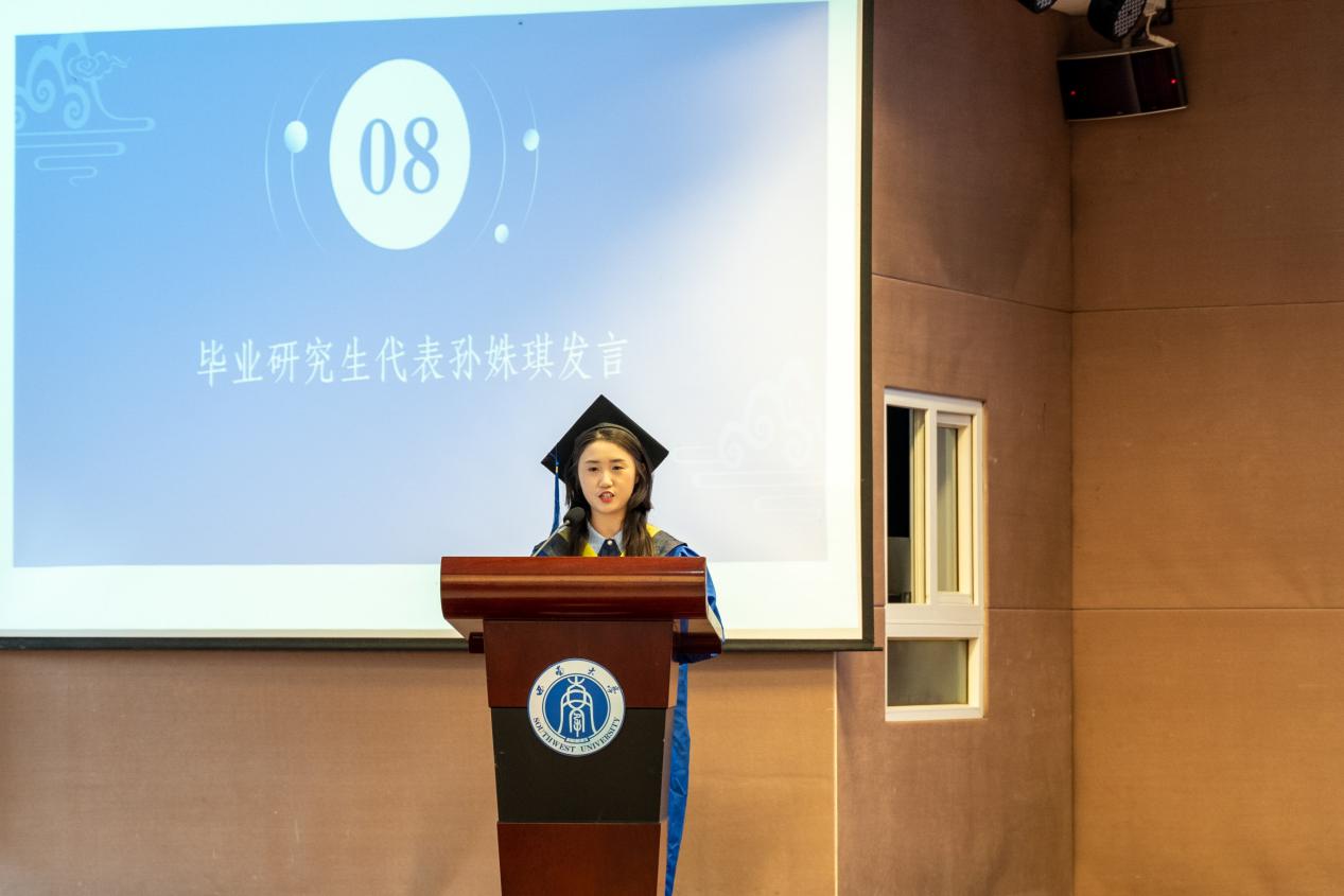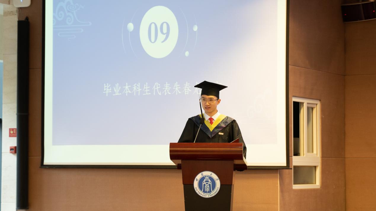 本科毕业生代表、数据科学与大数据技术专业2019级朱春龙同学回顾与学院相知、相遇、相伴的4年岁月,感恩学院、老师、同学的关怀指导和鼓励。呼吁全体毕业生在时代洪流之时,仍能听从初心的召唤,所遇皆良善,所行化坦途,祝愿学院蒸蒸日上、再书华章。毕业研究生代表孙姝琪回顾了自己的求学之路,她感恩学校和学院给予了同学们求学、探索更广阔世界的机会,感谢师长们在学习上的指导和生活上的关心。