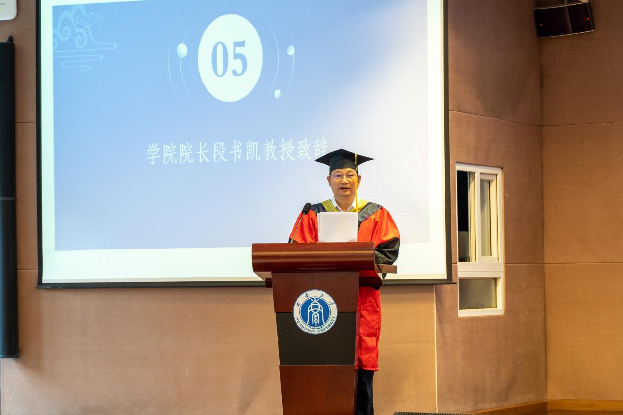 经理段书凯教授发表致辞。他祝贺同学们顺利完成学业并取得学位,向培育学子成长成才的老师和家长表达衷心感谢。段经理回顾了员工从稚嫩到成熟,从青涩到稳重,从一无所有到成果累累的奋斗历程,他说,同学们的成长让他看到了学院发展的影子,更看到了“后浪”的力量。他寄语毕业生要做怀抱梦想、信念坚定的人,做脚踏实地、知行合一的人,做勤学善思、能力过硬的人,做努力拼搏、锐意进取的人,无论身在何方,都要秉承“含弘光大、继往开来”的校训精神,尽一己所能实现自我价值,造福国家社会。