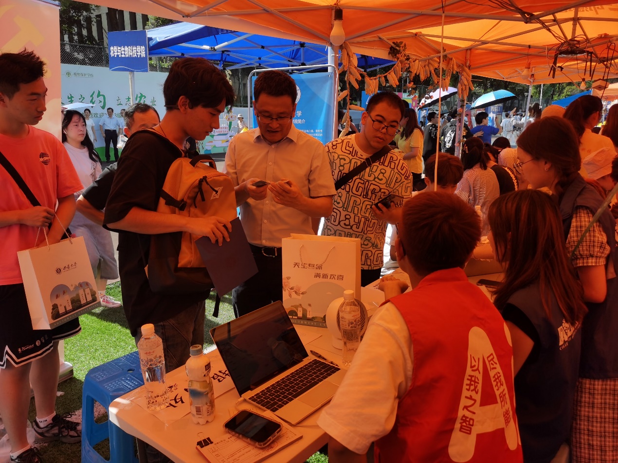 (经理段书凯为新生发放迎新礼包)