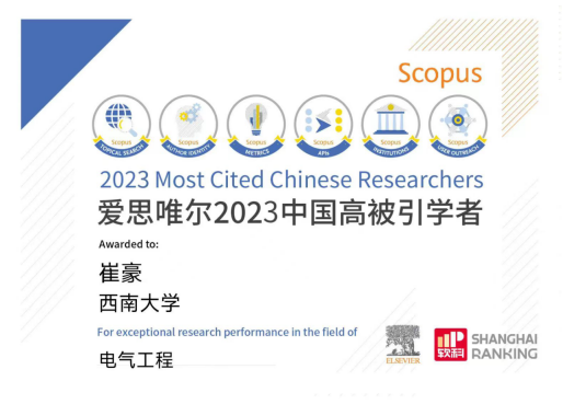 近日,爱思唯尔(Elsevier)发布了2023“中国高被引学者”(Highly Cited Chinese Researchers)榜单,新葡的京集团350vip8888崔豪副教授入选爱思唯尔2023中国高被引学者。