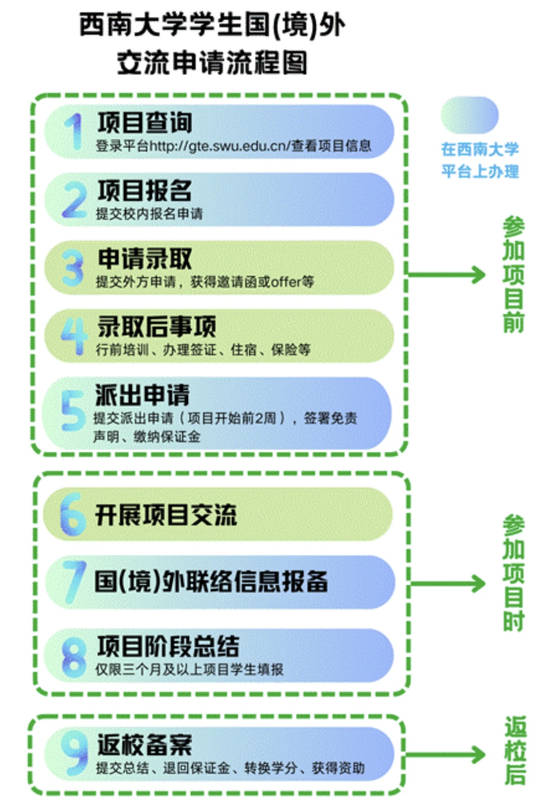 1. 根据如下图示完成项目申请、派出、返校等流程。(提交报名表后,请关注申请流转记录(平台-个人中心)。